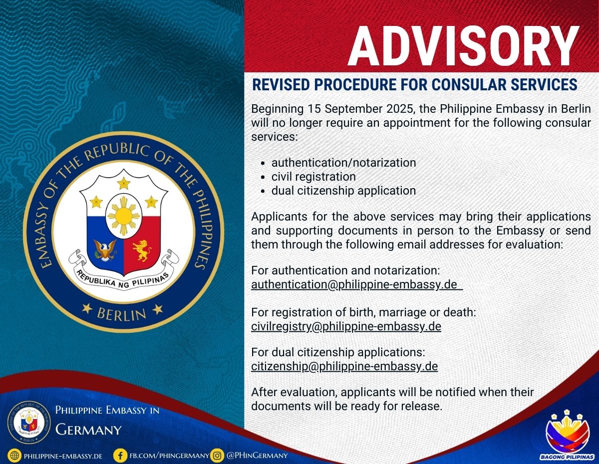 Beginning 15 September 2025, the Philippine Embassy in Berlin will no longer require an appointment for the following consular services: